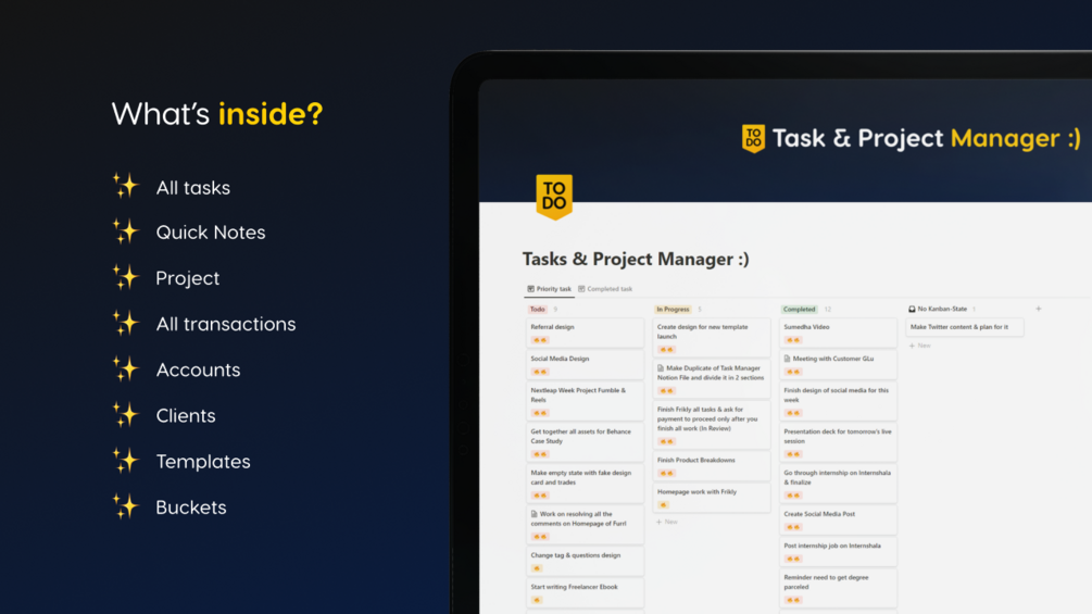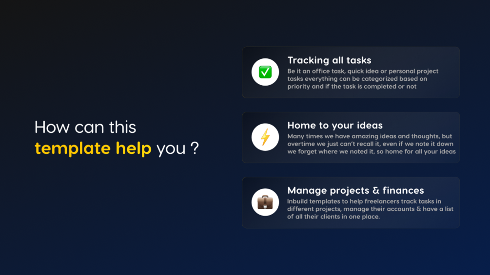 This is a template to help you keep track of all your tasks, projects, ideas, finances & clients.